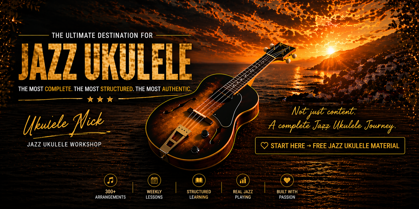 Through 300+ chord-melody arrangements, structured lessons, and The Jazz Ukulele Method, you move step by step — from learning to playing to creating.